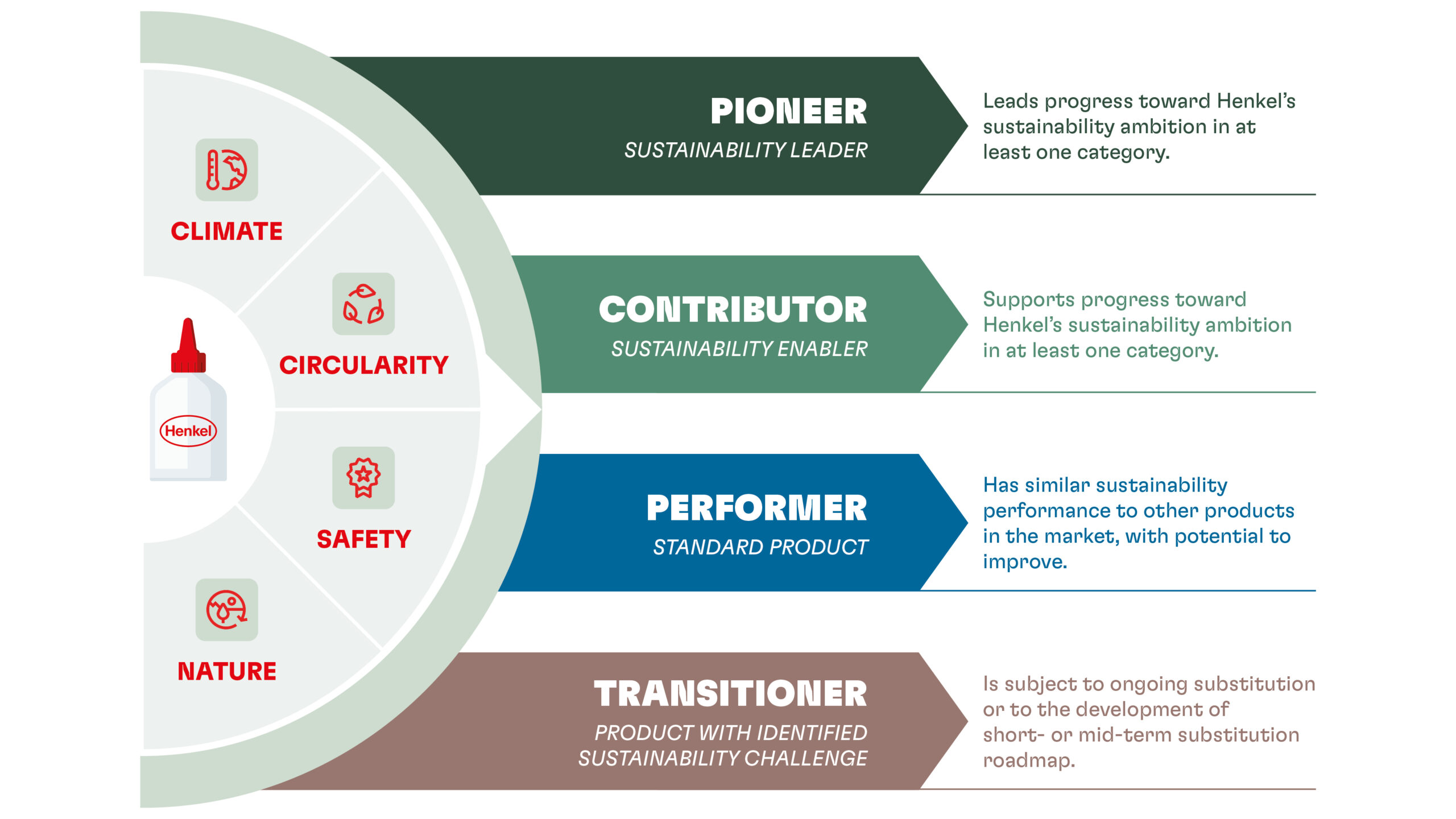 Since 2023, Henkel has implemented a structured sustainability portfolio assessment methodology that classifies products into four sustainability categories based on their performance across key dimensions, including climate, circularity, safety, and nature. This framework provides a consistent and company-wide view of sustainability performance throughout the product lifecycle and supports more informed business decisions. The methodology has now been updated to reflect stricter criteria, ensuring alignment with evolving regulatory requirements, customer expectations, and Henkel’s commitments to net-zero emissions and responsible chemistry. The revised approach has been independently audited, and the results from 2023 and 2024 indicate that initial transformation measures are already delivering tangible progress toward a more sustainable and resilient product portfolio.