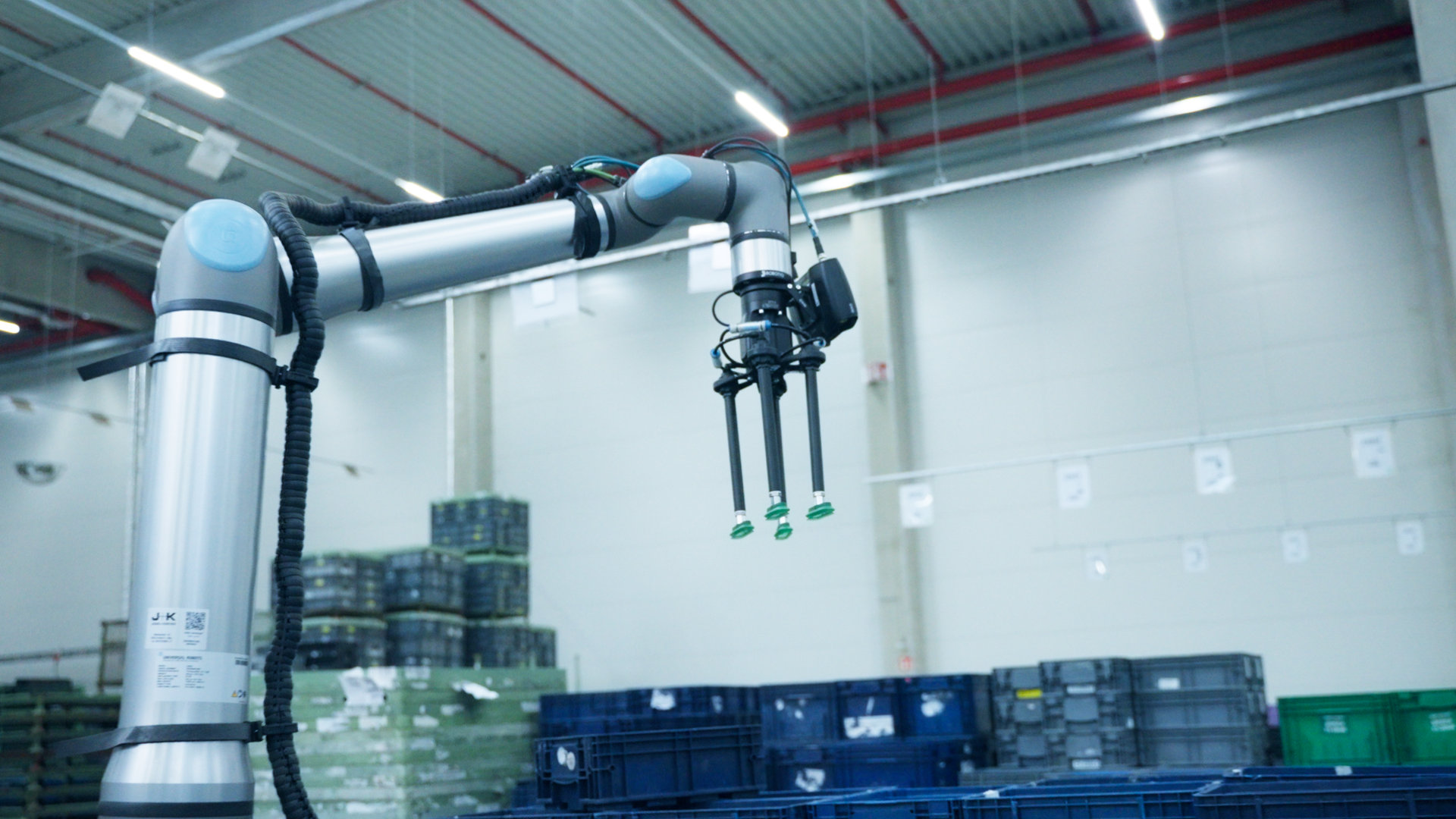 At the facility, approximately 12,000 small load carriers (SLCs) are processed daily, requiring sorting, inspection, and preparation for reuse. The newly implemented system features a cobot equipped with a 3D camera and AI-based image recognition, enabling it to identify different container types and their positions regardless of orientation on the conveyor belt. Using a suction gripper, the robot then picks and stacks the carriers onto pallets according to predefined specifications.