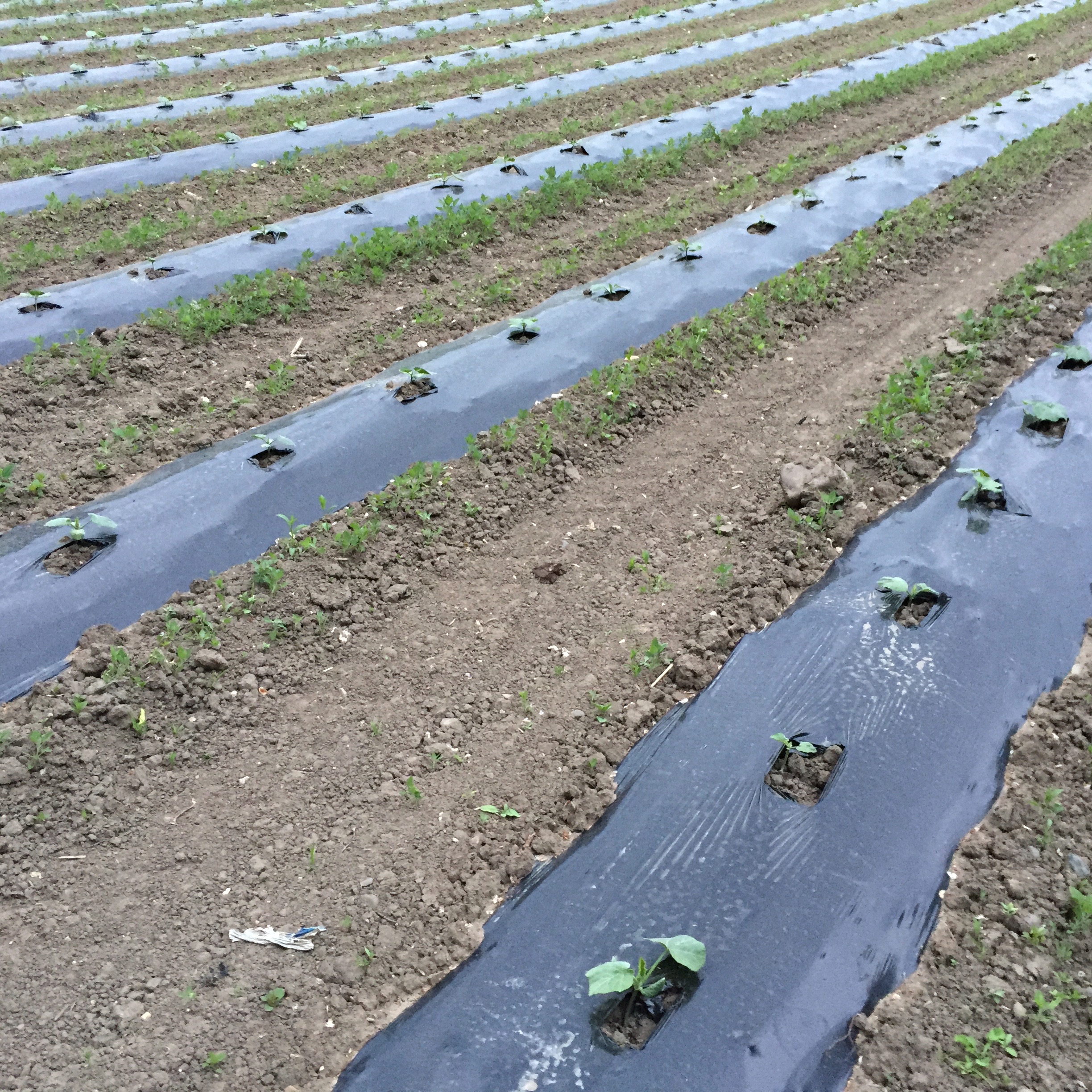 Rows of lettuce plants growing on black mulch film in an outdoor field bed under sunny skies.